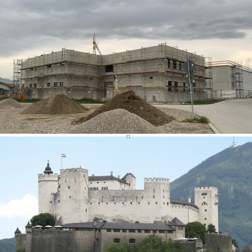 Jedesmal wenn ich an der Baustelle des neuen Bauhofs vorbeikomme habe ich das Gefühl, dass es mich an irgendwas erinnert. Abweisend, massiv, nicht zeitgemäß. Dann fiel es mir wir Schuppen von den Augen: ja, es erinnert mich an die Salzburger Festung.