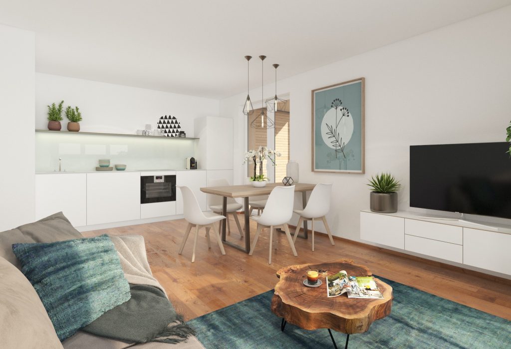 Man bezeichnet das im Werbeartikel des Freilassinger Anzeigers als gehobenen Wohnbau. Entsprechend – wie auch schon beim Sonnenfeld – zeigt die beigefügte Landkarte auch, wen man denn so als Zielgruppe ausgemacht hat. Wenn das noch nicht genügt kann man sich auch die beworbene Innengestaltung ansehen. Nahezu fensterlose Räume, in denen die Küchenzeile gleich neben der Couch ist. Als hätte man das vor 15 Jahren aus einem KARE 3D Programm geklaut. Das ist nicht für richtige Familien gedacht.