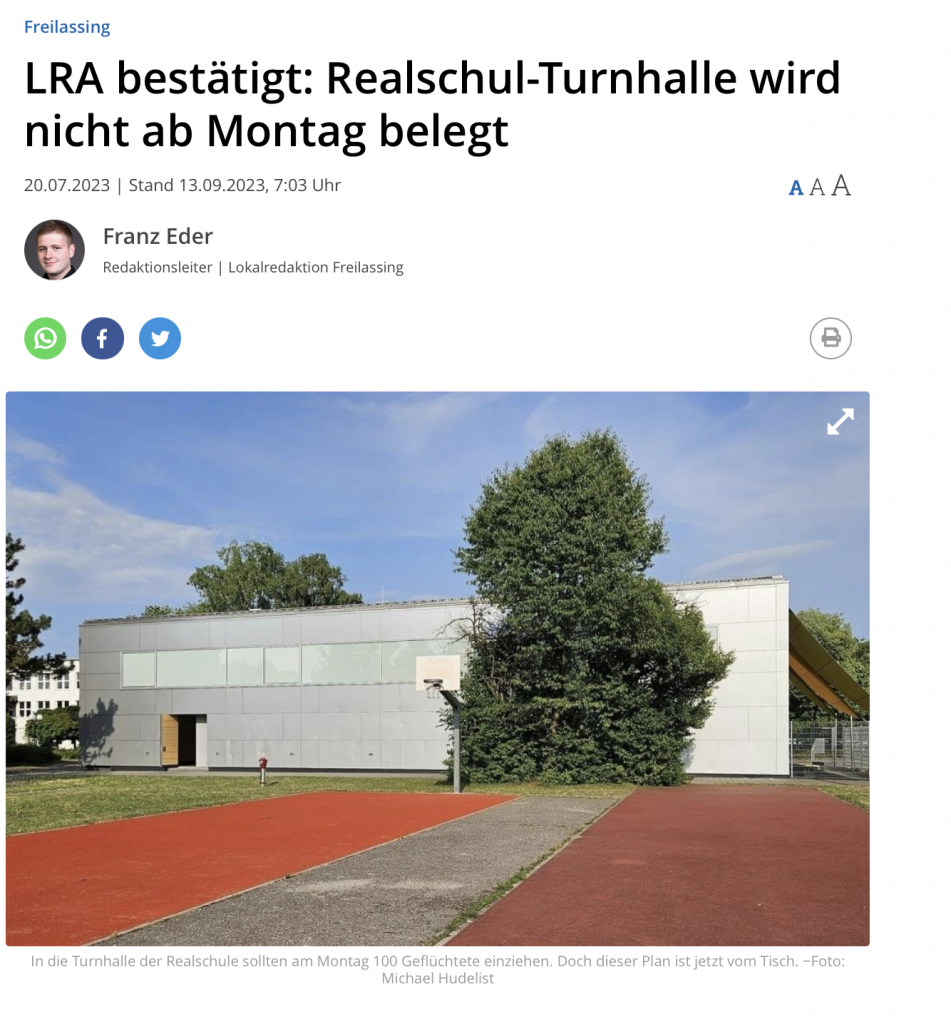 „LRA bestätigt: Realschul-Turnhalle wird nicht ab Montag belegt” vom 20. Juli 2023