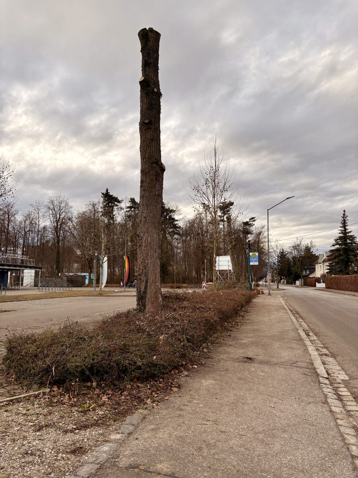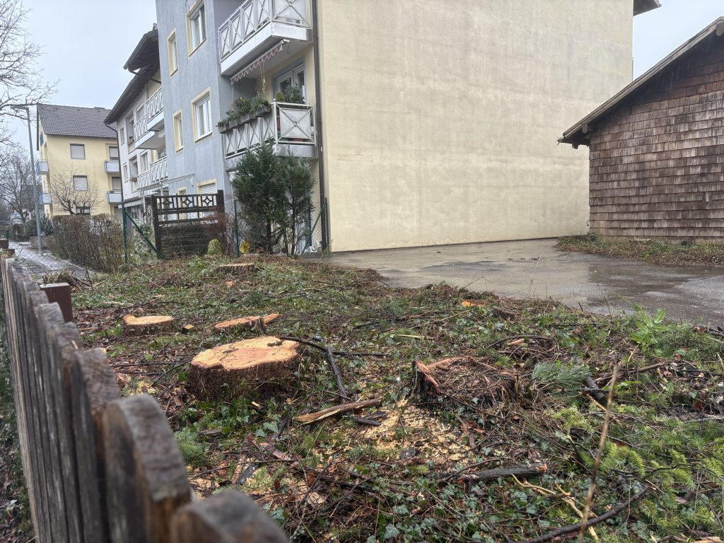 Am nächsten Tag nahm ich die Brille ab und hatte Kopfschmerzen. So drehte ich meine Runde durch die Stadt, vorbei am “gepflegten” Matulusgarten, den vermüllten Häusern daneben. Ich sah wie allerorts Bäume gefällt werden. “Ui, die sind ja bestimmt alle krank. So viele”. Klar, das Ölbacherl muss befreit werden und dem bösen Biber Einhalt geboten werden. Man könnte meinen, da wäre ein Kern zuständig gewesen. Dazu braucht man auch Wege für Maschinen, die den Pistorius vor Neid erblassen lassen.