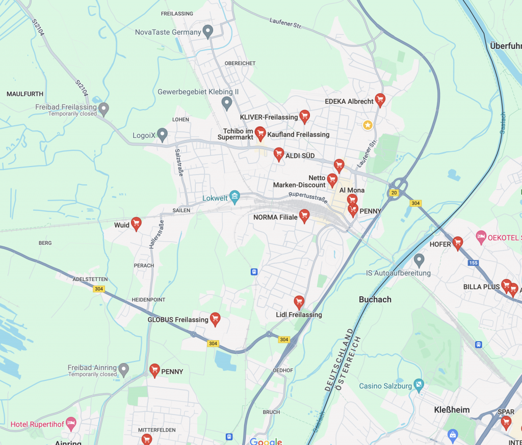 Hier in Freilassing gibt es 8 Supermärkte unterschiedlicher Grösse mit einem Einzugsgebiet weit über die Gemeindegrenzen hinaus. Man identifiziert sich hier als Einkaufsstadt. Und das macht sich auch in der Stadtkasse bemerkbar. Ainring ist nicht an der Innenstadt Malaise schuld.