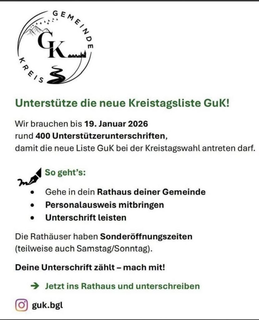 In diese Scharte scheint auch eine neue Gruppe “GuK BGL” zu schlagen. Sie wollen ein Bindeglied zwischen Gemeinden und dem Landkreis sein, wollen sich aber politisch nicht festlegen. Gewählte Volksvertreter sind ja in der Regel auch Interessenvertreter. So wird das aber schwierig, wenn man nicht sagt, welche Interessen man denn vertritt. (Ja, “kein Extremismus” hab ich gelesen.) Sagen wir’s so: wenn ich in ein Restaurant gehe und man bietet mir Pizza, Burger, Cevapcici, Thai-Curry und Borschtsch an, dann bin ich entweder beim Bonami oder es stellen sich mir Fragen über Qualität und mehr. Leute, was krieg ich, wenn ich für euch unterschreib? Ist doch nicht so schwer, oder?