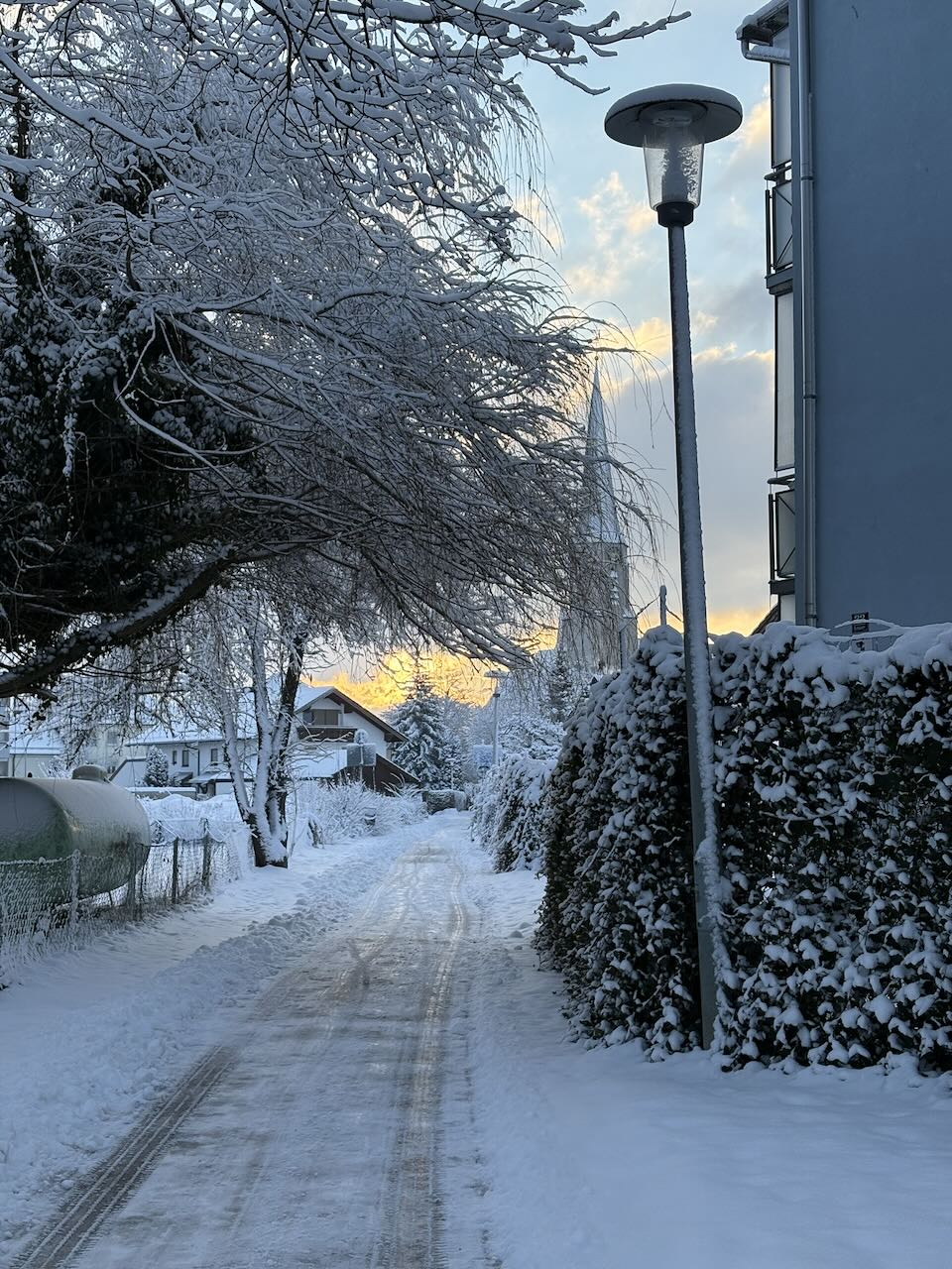 Passenderweise zum Ende der Weihnachtspause präsentiert sich die kleine Stadt mit Ambitionen und ohne Geschichte – so möchte man meinen – im schneebedeckten Winterkleid. Dass manche Räumdienste am Sonntag frei haben, verstärkt diese Impression nur. Dafür sieht man bei vielen Häusern endlich einmal die Bewohner, die fleissig den Schnee beiseite räumen, weil sie wissen, was sich gehört.