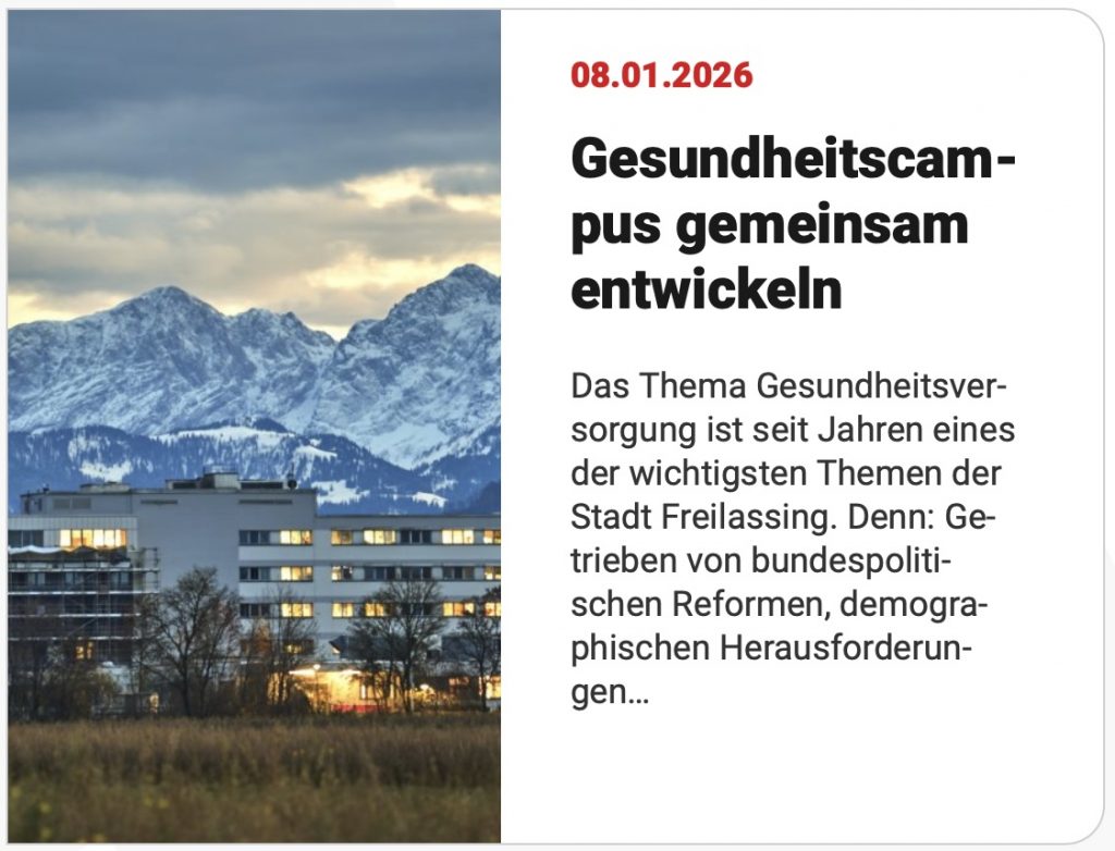 Pressemeldung der Stadt Freilassing zum Gesundheitscampus: https://www.freilassing.de/gesundheitscampus-gemeinsam-entwickeln/